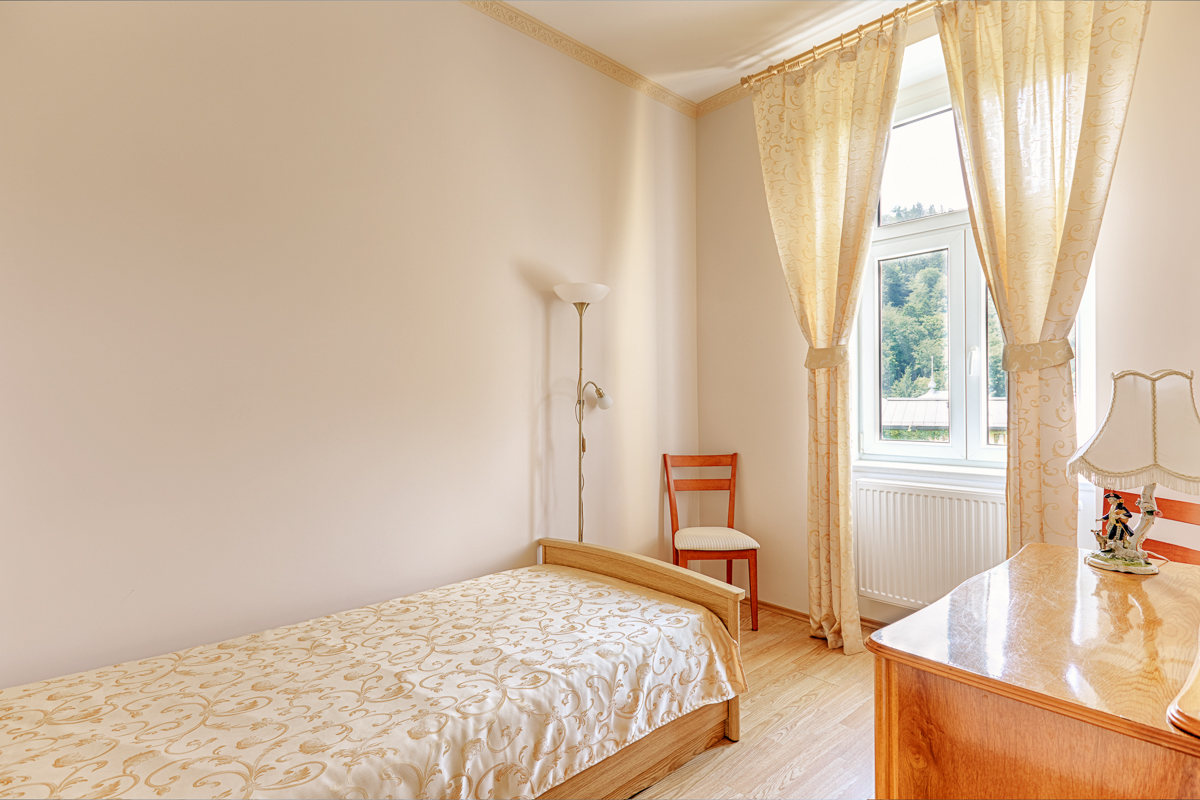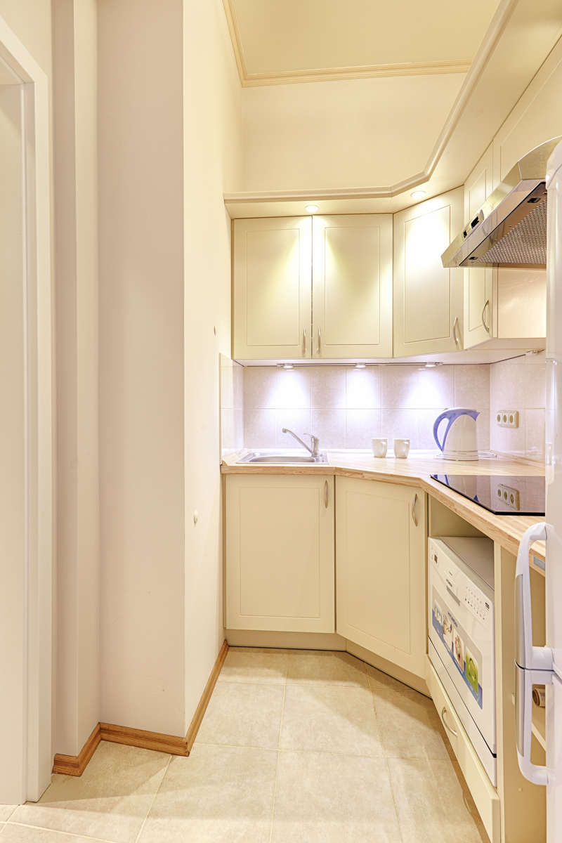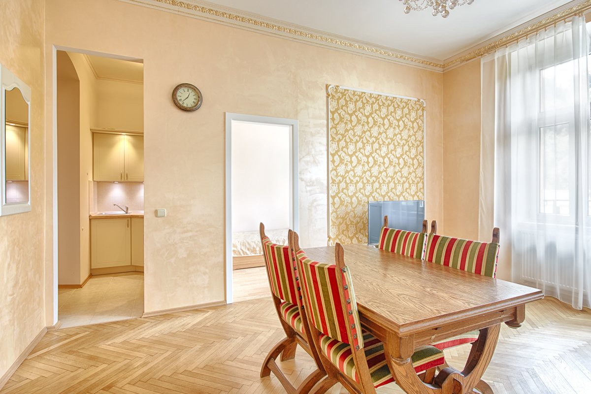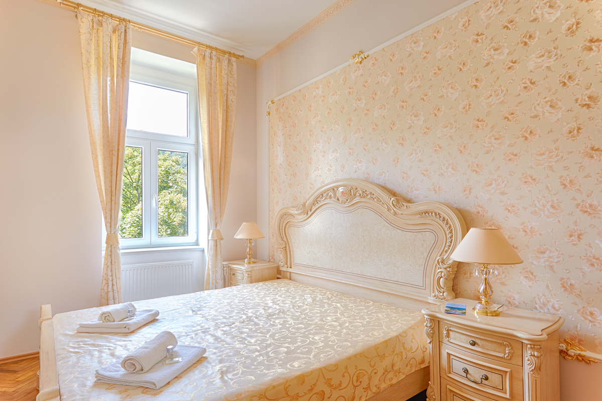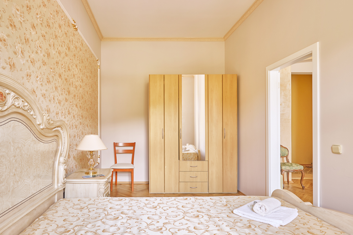 The apartment GOLDEN is situated on the 1 floor. You can enjoy beautiful view to the mountains and garden from the balcony. The apartment has a living-room, a kitchen, 2 bedrooms (1-for 2 people, 2- for 1 person), a bathroom. In the living-room there is a wide screen LED TV set, a table with chairs, 2 armchairs. There are hand-made wall-paintings in the living-room. Kitchen includes a dishwasher, a fridge, a toaster, a microwave, all necessary dishes, cleaning products. In the apartment there are iron, ironing board, vacuum cleaner, washing machine, clothes dryer. We are living within 5 minutes going from the apartment. The guests are able to reach us any time they need. Please, call us not less than 1 hour before your arrival. We will meet you. Please, in case you are coming by car inform us beforehand. Unfortunately, in our apartments accommodation with animals is not possible.In case the guests come for more than a week one more bed linen set and extra towels is provided. For extra payment cleaning during period of accommodation is possible.